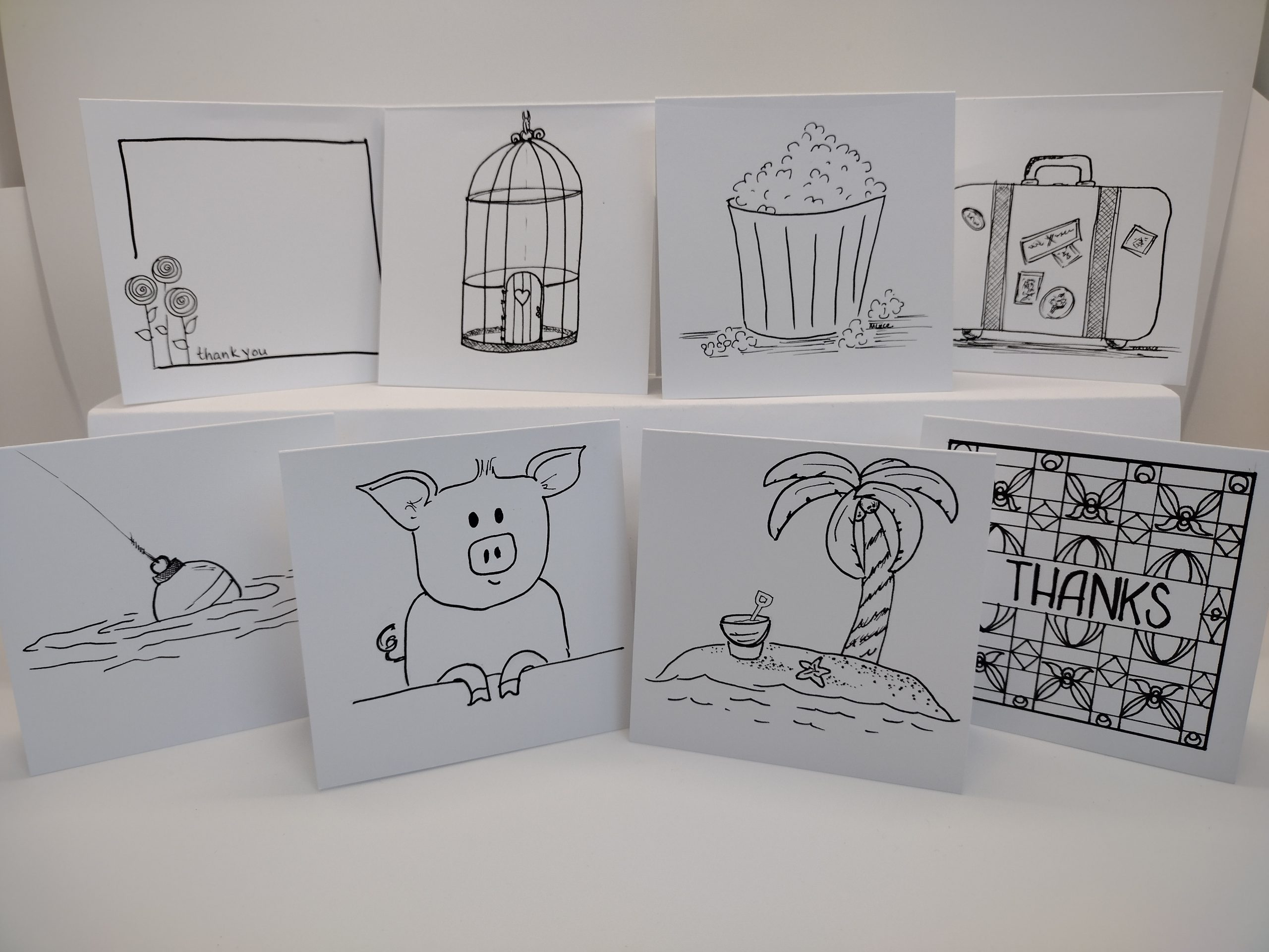 Assorted 3×3 Hand drawn cards in archival ink, LUCE Originals 3×3 cards with envelopes. Pack #1