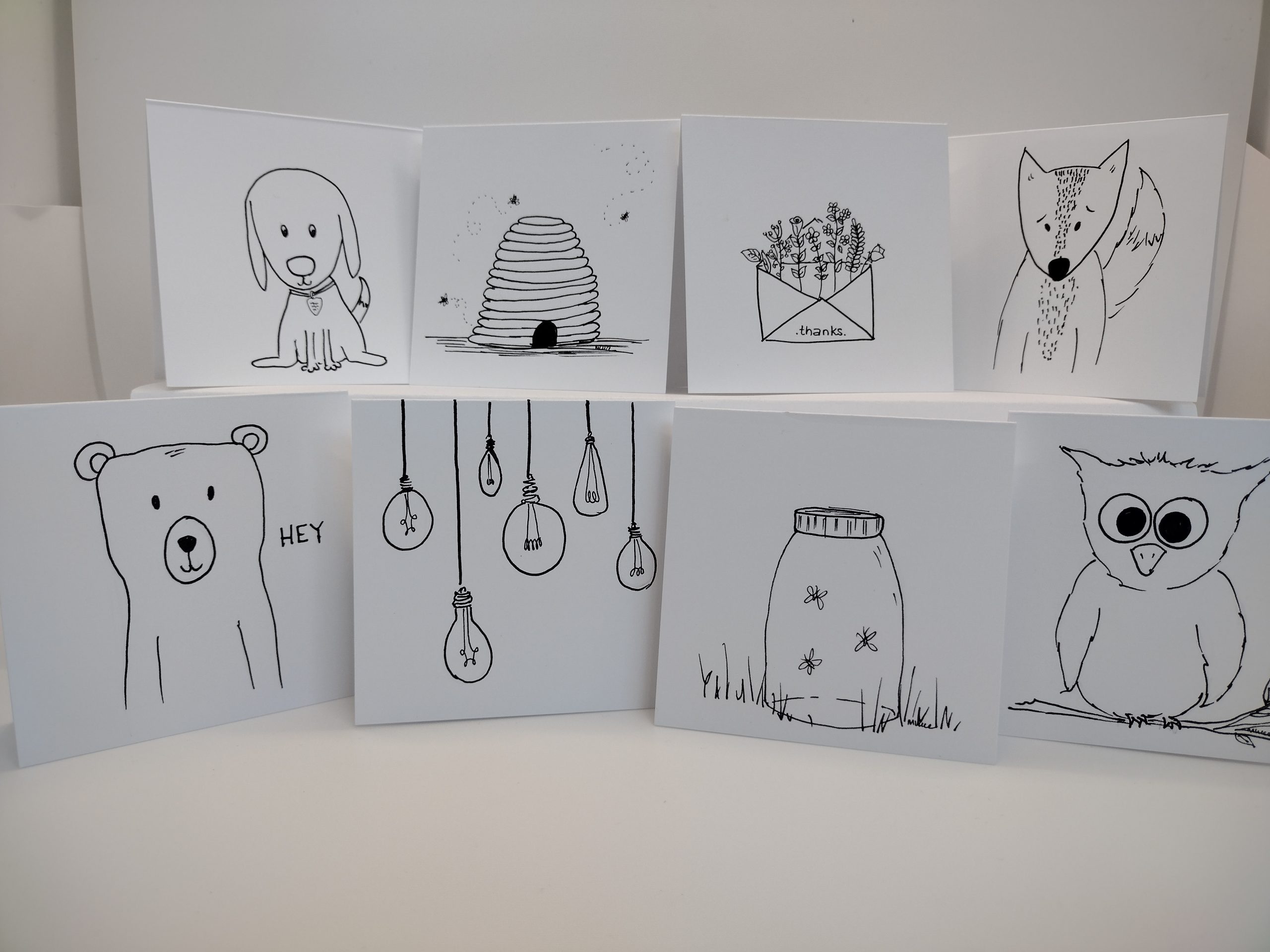 Assorted 3×3 Hand drawn cards in archival ink, LUCE Originals 3×3 cards with envelopes. Pack #2