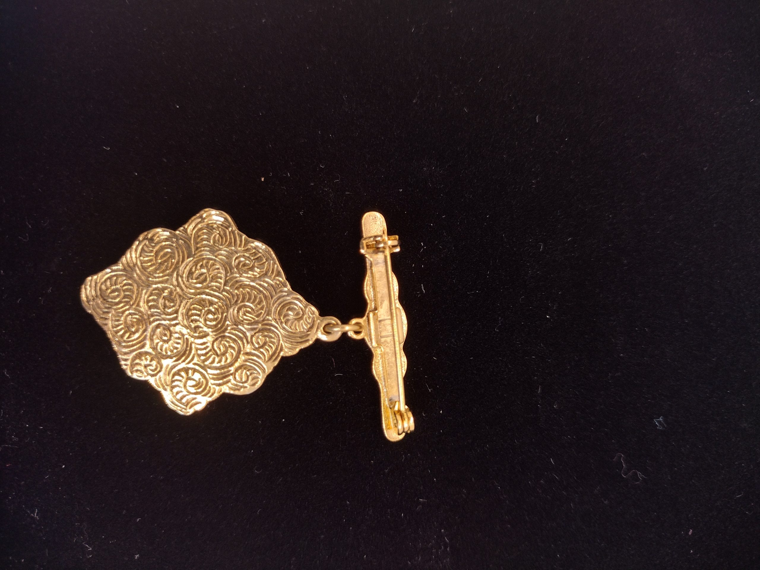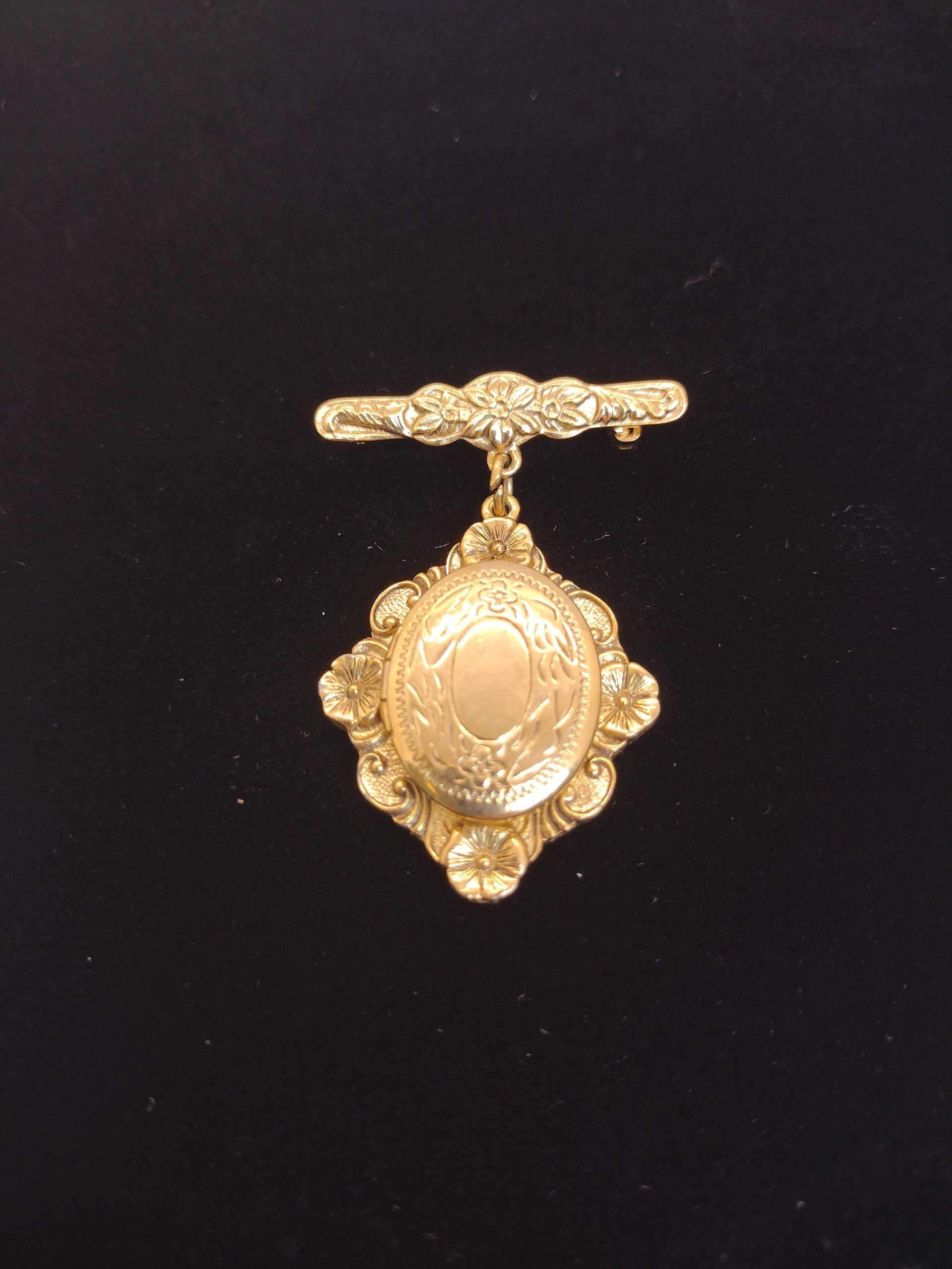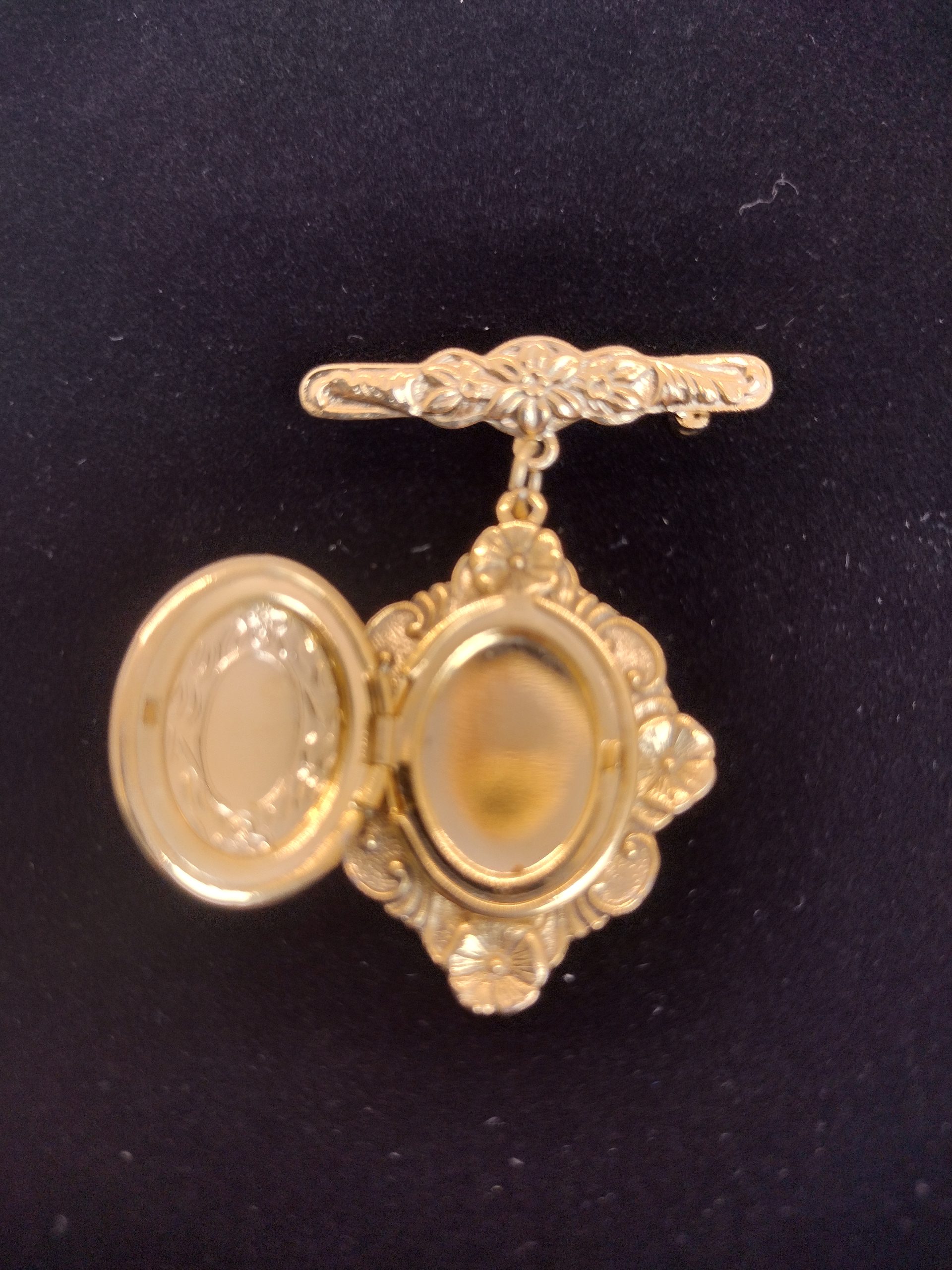 This gold‑tone locket pin showcases intricate floral and scrollwork detailing, capturing the beauty of classic antique design. A charming accessory that feels both decorative and sentimental. Value:$25 Donated by Dottie Anderson