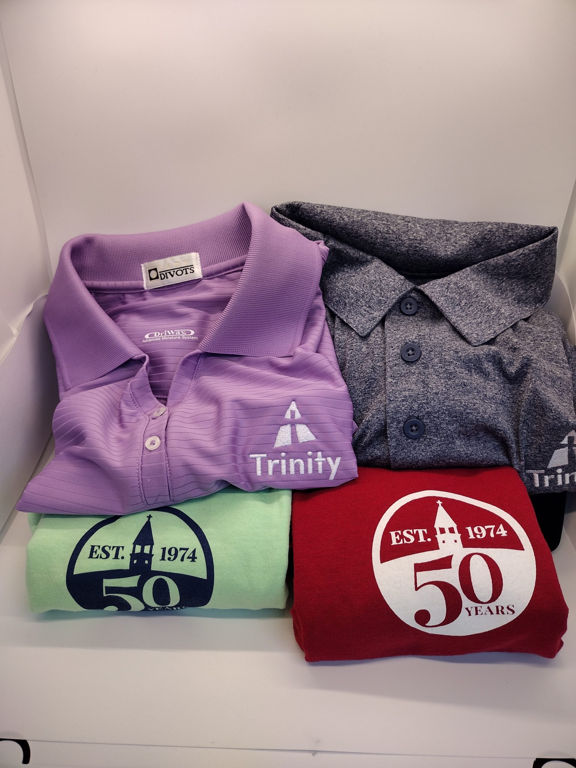 Outfit the whole family in Trinity Baptist Church logo apparel with this versatile four‑piece shirt collection. The set includes a women’s medium lavender golf shirt, a men’s XL heathered navy golf shirt, a child’s small mint‑green T‑shirt, and a child’s medium garnet T‑shirt—each one featuring the Trinity Baptist Church logo. These comfortable, high‑quality shirts are perfect for church events, volunteer days, or showing your Trinity pride around town. A wonderful way to support our ministry while keeping your family coordinated and stylish. In a Trinity reusable shopping bag. Value: $65 Donated by Trinity Baptist Church